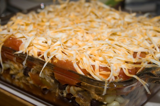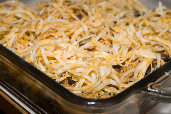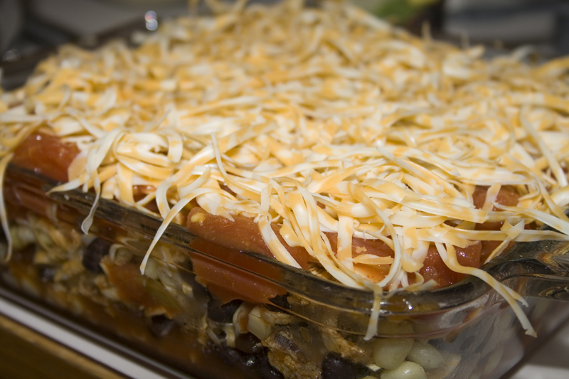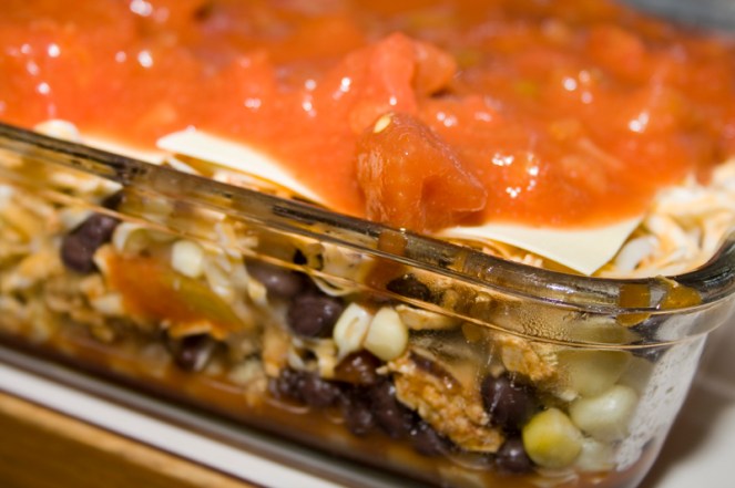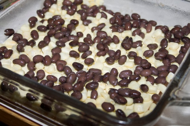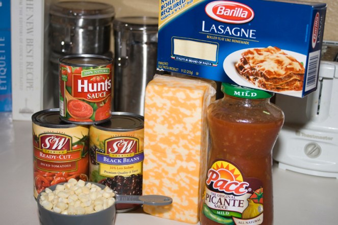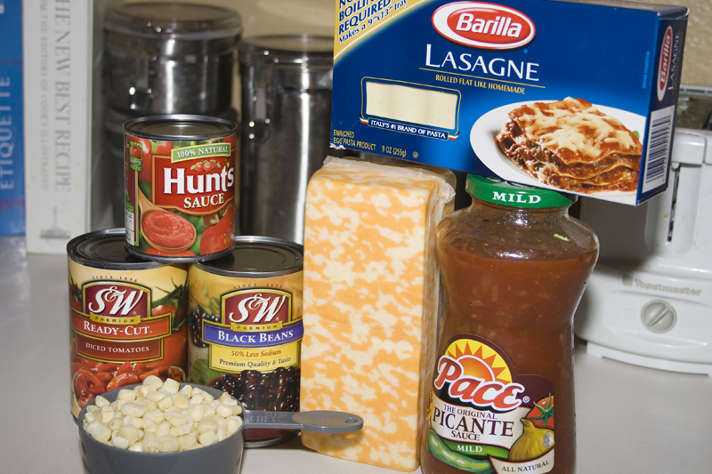 First some combined ethnic flavors. Tomatoes, sauce and pasta for the Italian side of things. Black beans, Mexican blend cheese and salsa coming in the Mexican corner. Pretty sure corn is an American product.