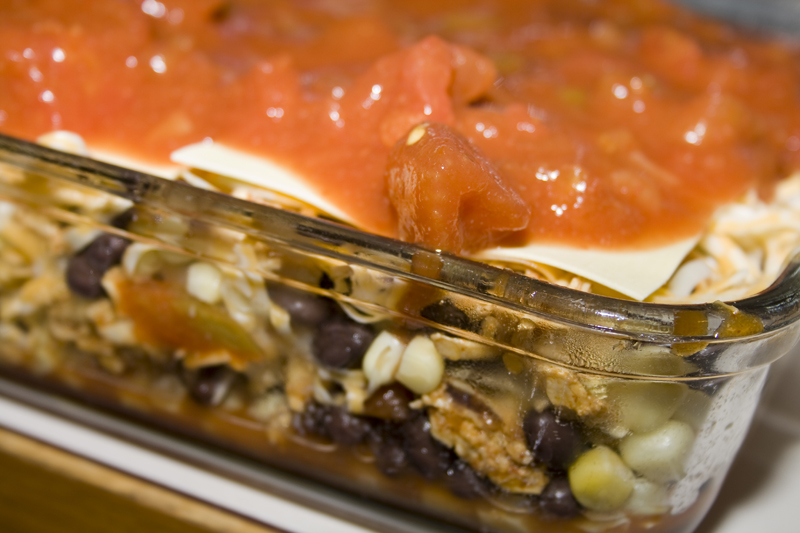 2. Combine first 4 ingredients, spread 2/3 cup sauce in the bottom of an 8-inch square baking dish coated with non-stick cooking spray. Arrange 2 noodles over sauce, top with 1/2 cup corn, 1/2 the beans and 1/2 the chicken. Sprinkle with 1/2 cup cheese, top with 2/3 cup of sauce. Repeat layers once, top with remaining two noodles. Spread remaining sauce over noodles. Sprinkle with remaining 1 cup of cheese.