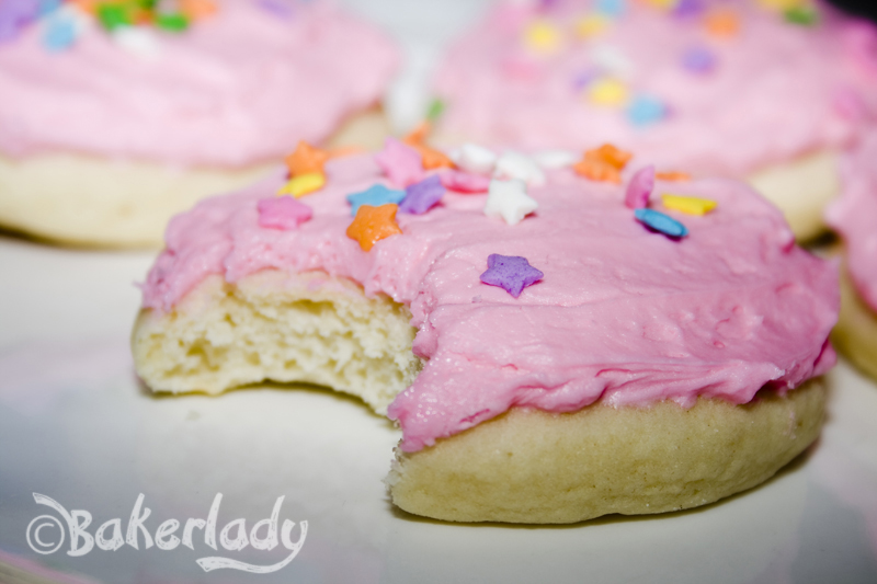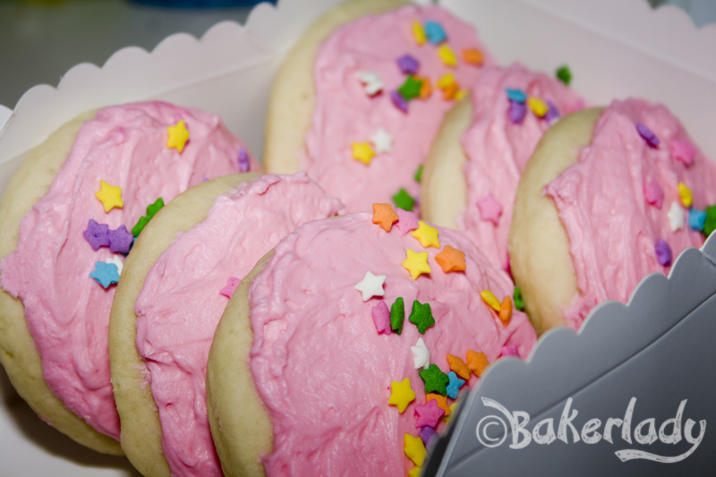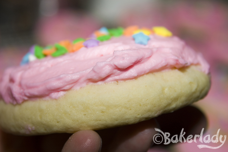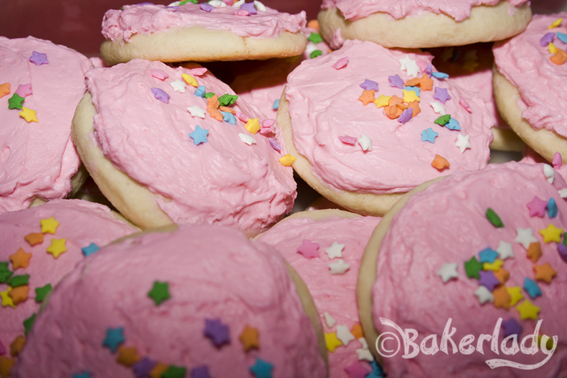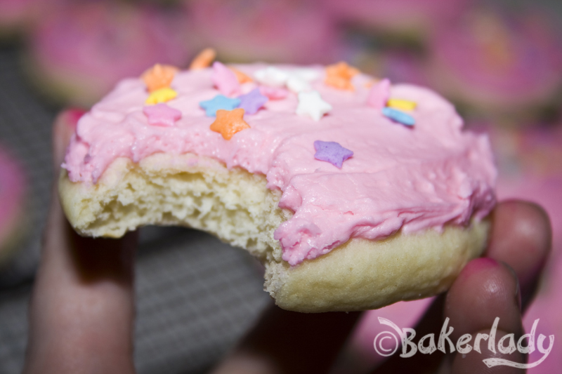 Now, maybe it’s just me (or my kids…they helped with the frosting), but we ran out of the pink stuff before all the cookies were done. So if you’re a fan of piled high sugary goodness atop your cookies, may I suggest a double batch of the frosting? Look how pillowy soft they are! Gorgeous!