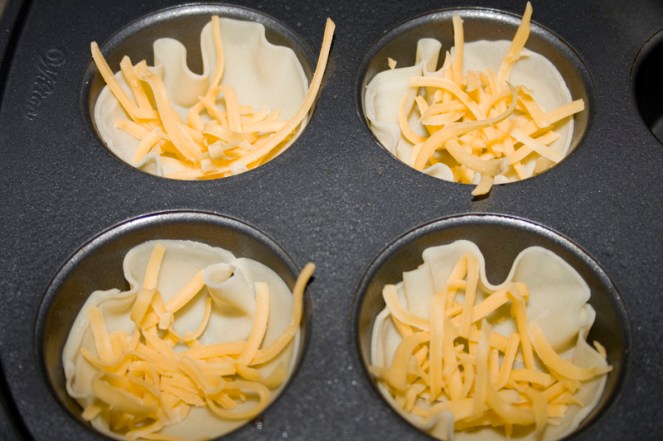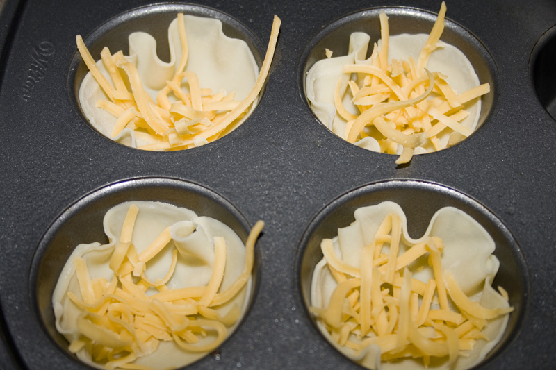 Start with wonton wrappers (found in the cold section of most grocery stores over by the cold salad dressings and the soy cheese stuff) and press them into cupcake tins sprayed with non-stick cooking spray. Top with cheese of your choice.
