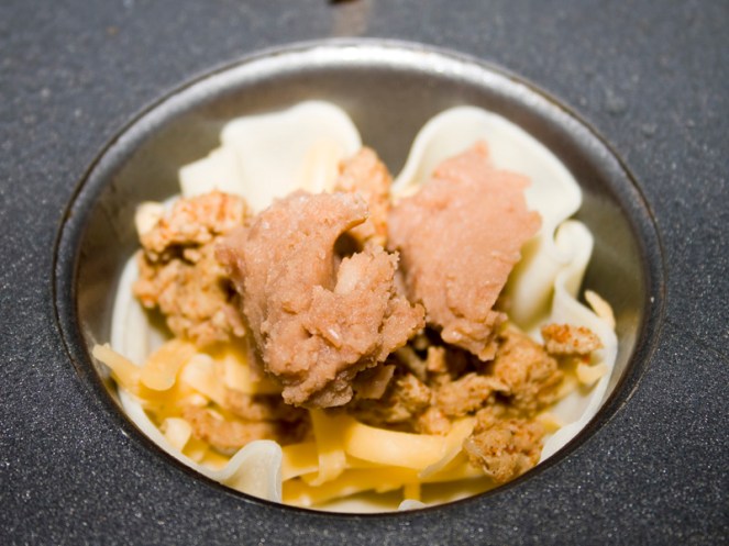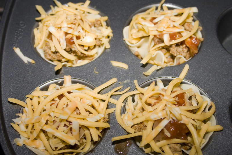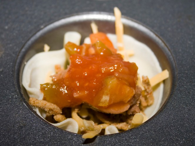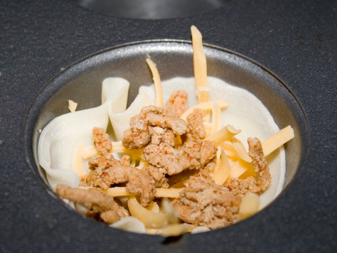 Then we’ll layer up some ingredients. Meat, refried beans and salsa went into mine.