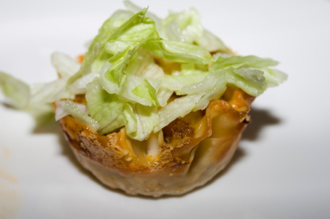 You will need about 2 Tablespoons of each topping per taco cup. In a non-stick sprayed muffin tin layer your ingredients twice starting with the wonton wrapper. Bake at 375° for 18-20 minutes. Allow to cool a few minutes then remove from muffin tins. Top as desired with sour cream, guacamole, lettuce and tomatoes.