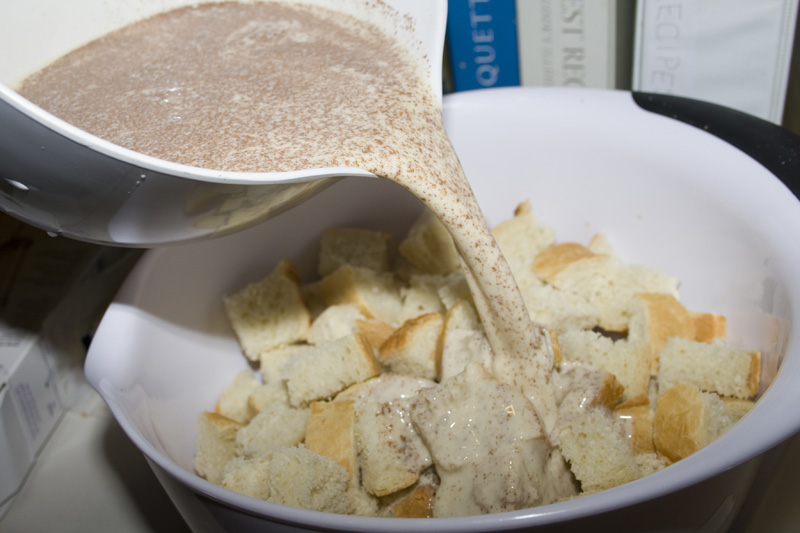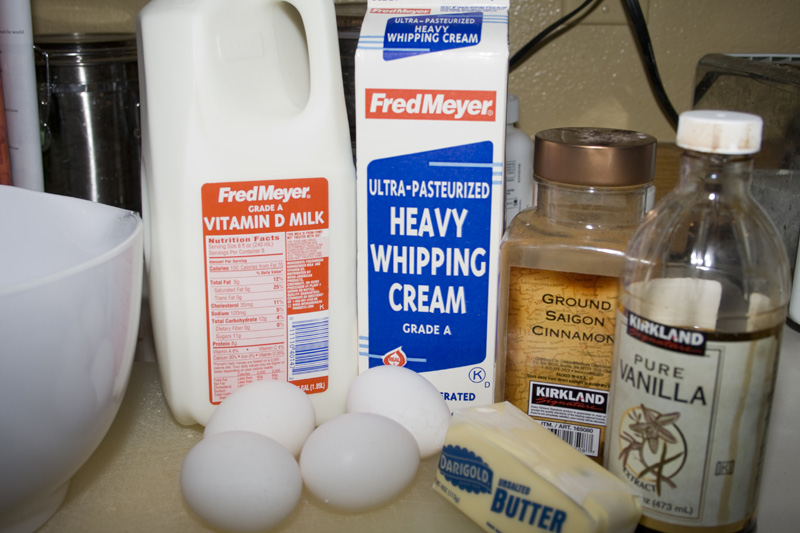 Then we’re going to make a rich sauce for all that bread. With some of the best stuff on earth. Cream, milk, eggs, sugar, vanilla & cinnamon. The butter we’ll get to later.