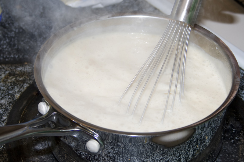 Bring to a boil. Add a little cornstarch/water mixture to thicken things up and then whisk while boiling for a few minutes (this is the “hardest” part of the recipe).
