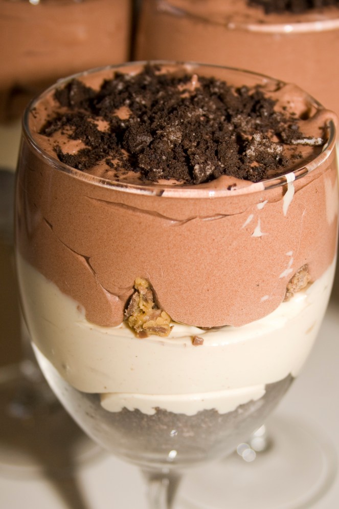 Lord save me from this dessert. Layers of Oreos, sweet peanut butter fluff and decadent chocolate mousse with a secret layer of peanut butter cups hidden inside. Mind blown. Taste bud explosion. I could die happy right now. I’ve been cured of my “meh” attitude regarding peanut butter and chocolate. You are going to kill me when you find out that this elegant looking dessert actually takes just minutes to put together and requires zero baking.