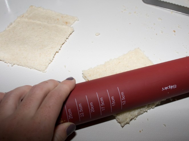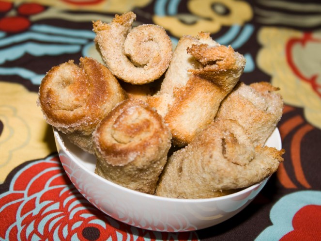 Cut the crusts from a slice of bread and roll until very thin. Spread both sides of the bread with melted butter and then sprinkle one side with the cinnamon sugar, making sure to cover very well. Fold each side into the middle and then gently roll up and place in a buttered mini muffin tin. Sprinkle with a little more cinnamon sugar.
