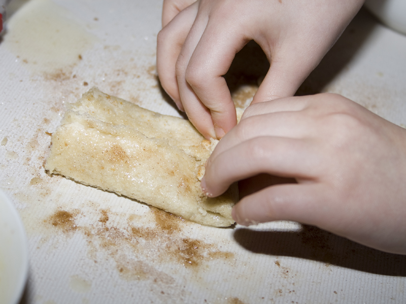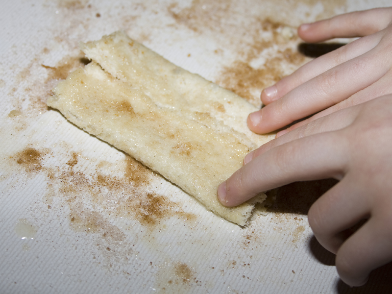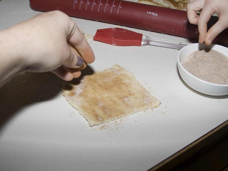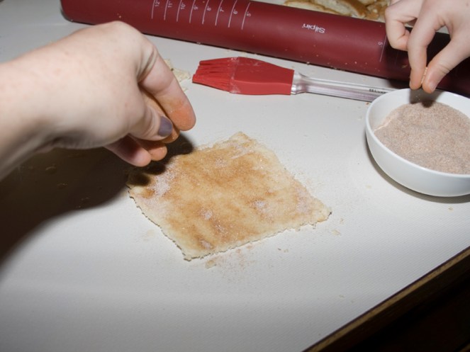 Then sprinkle one side with cinnamon sugar. My daughter helped me starting with this step.