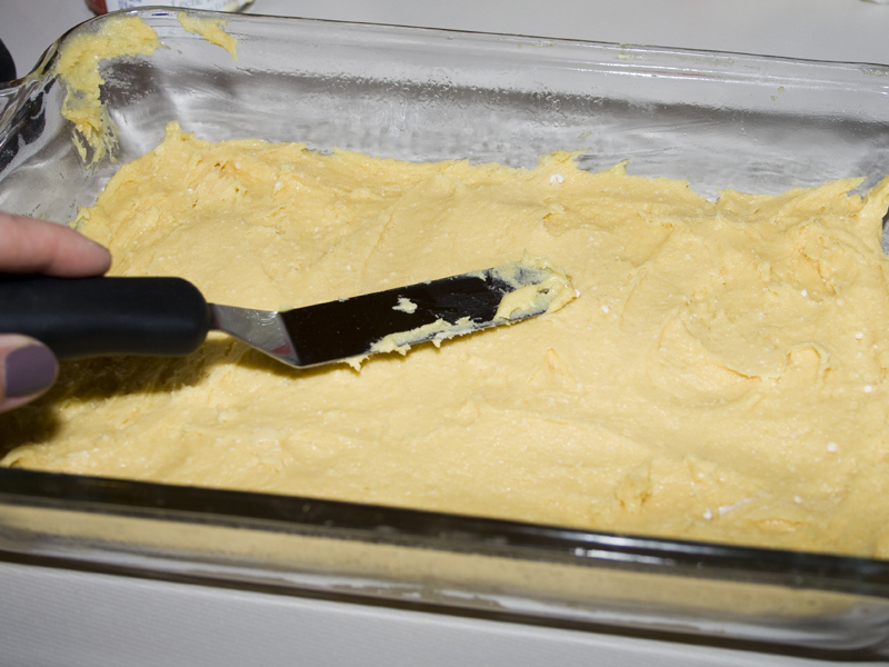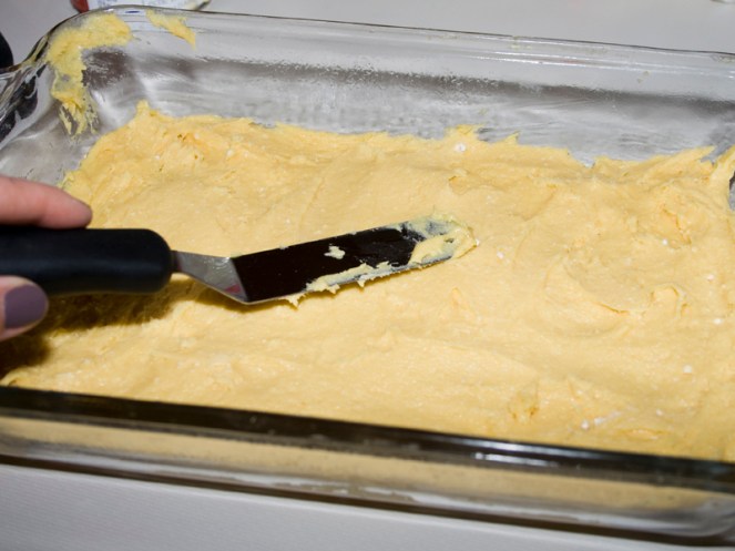 - Divide batter in half and press 1 half into the bottom of the pan.