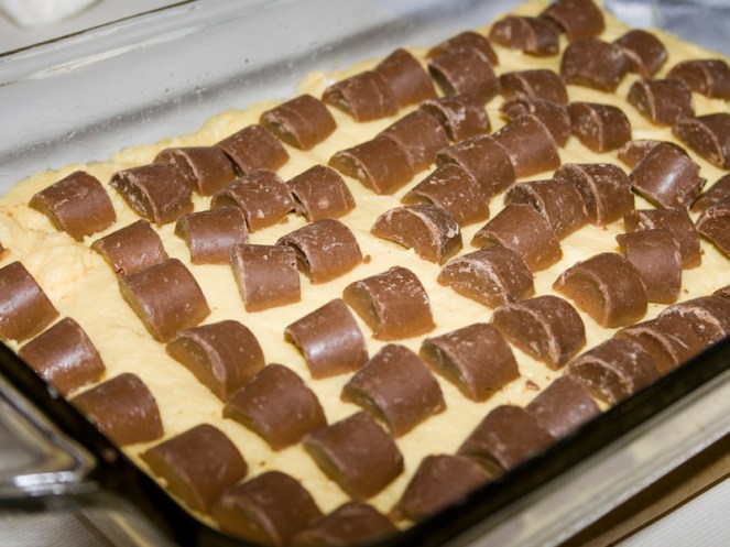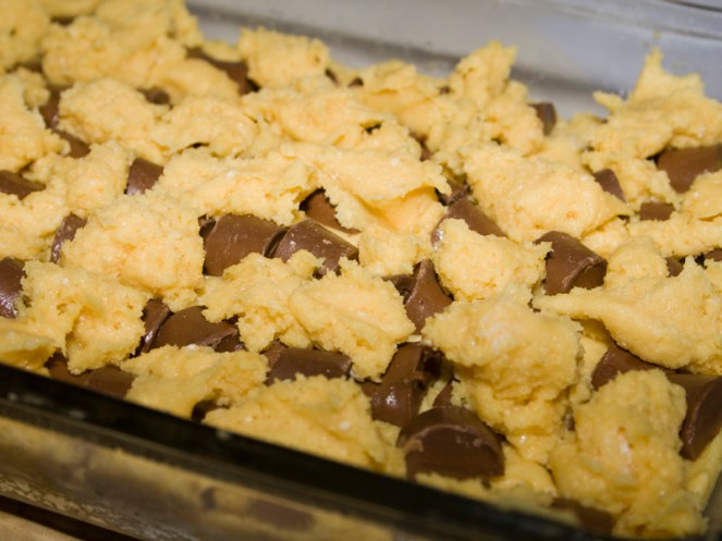When the crust comes out of the oven, place the Rolos caramel side down on top. Can I just say that the smell of warm cake batter hitting the chocolate was almost too much for me. I was tempted to just scoop it out of the pan and shovel it into my mouth.