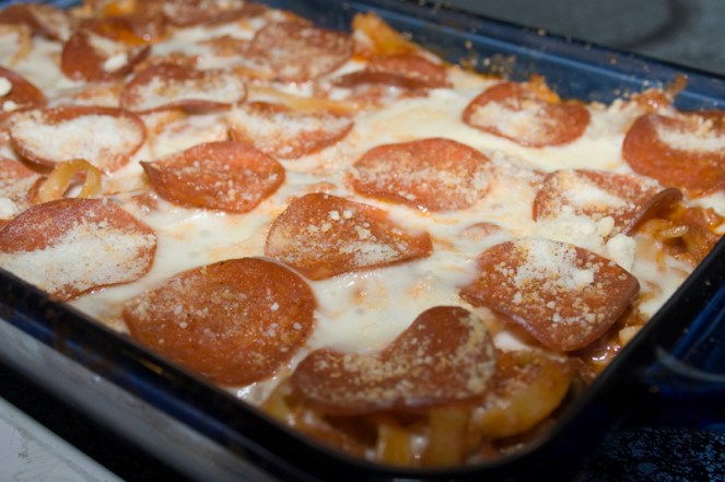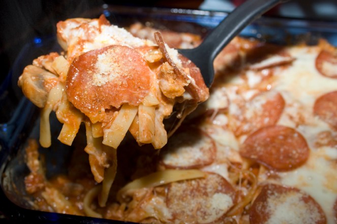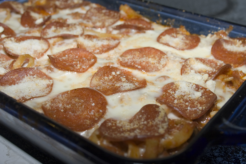 • Divide half of the mixture between two greased 2-qt. baking dishes; sprinkle each with 1 cup mozzarella cheese and top with half the pepperoni. Repeat layers. Top each with remaining pepperoni and Parmesan cheese.