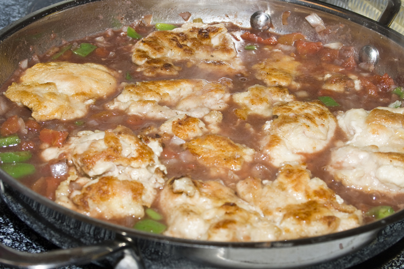 - Add the onion, garlic and bell pepper to the skillet and saute until the onion is slightly browned. Return the chicken to the skillet and add the tomatoes, oregano and wine. Cover and simmer for 20 minutes over medium low heat.