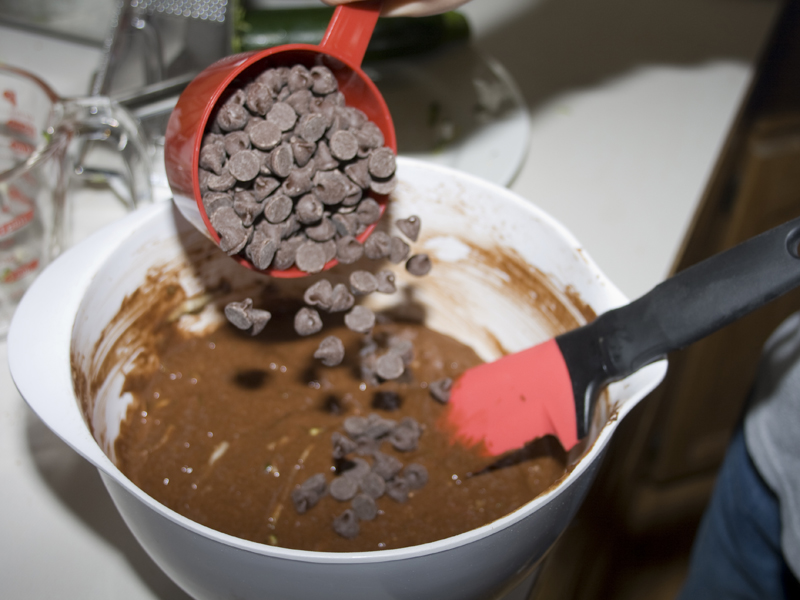 In a large bowl, combine your applesauce, sugars and vanilla. Mix in your eggs and shredded zucchini. In a separate bowl, sift together your flour, cocoa, salt, cinnamon, baking soda and baking powder. Slowly add this dry mixture into your wet mixture. Stir until combined. Mix in your chocolate chips.