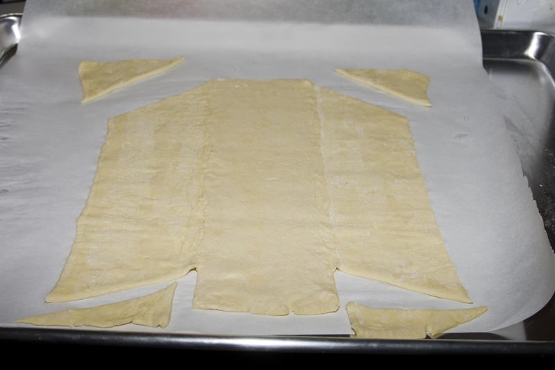 We start with some puff pastry, thawed. Roll it out a little then cut two triangles out of the bottom and slice off the corners at the top. Like this.