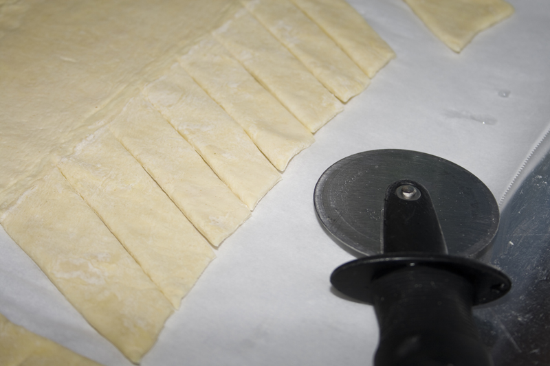 At an angle, slice off the top corners and cut two notches in the bottom. Slice 1-inch strips diagonally down both sides of the puff pastry, leaving the center uncut. Try to cut the same amount of strips on both sides. I had 8 strips per side. It helps if you start at the middle. Cut in half, then half again, and half again. Then all your pieces will be even.