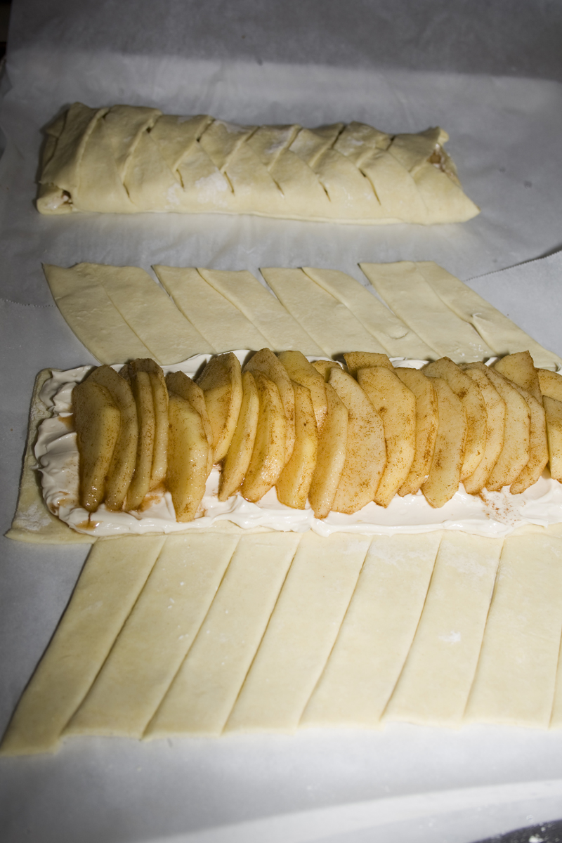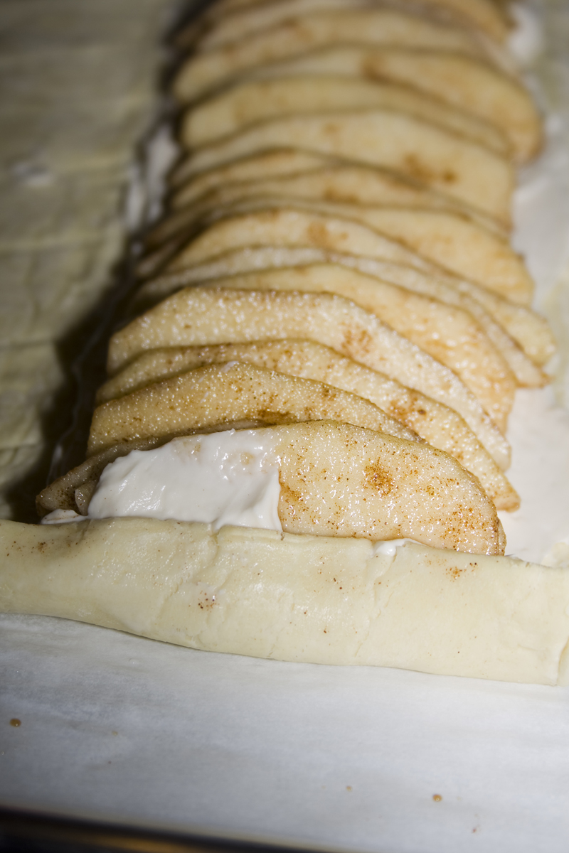 Add half of cream cheese filling, spreading it evenly down the center of the puff pastry. Top with apple slices.