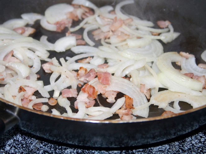 Chop the bacon, and cook it about half way. Then add some sliced onion into the pan and let it get all soft and yummy in the bacon grease. Why yes, this is a low-fat/low-calorie dish. How could you tell?