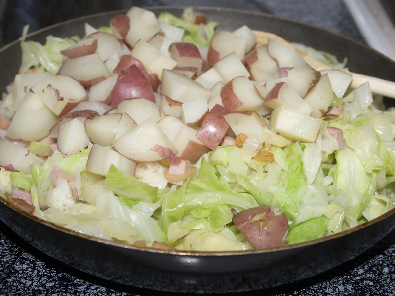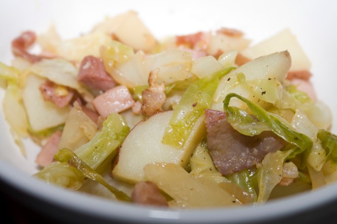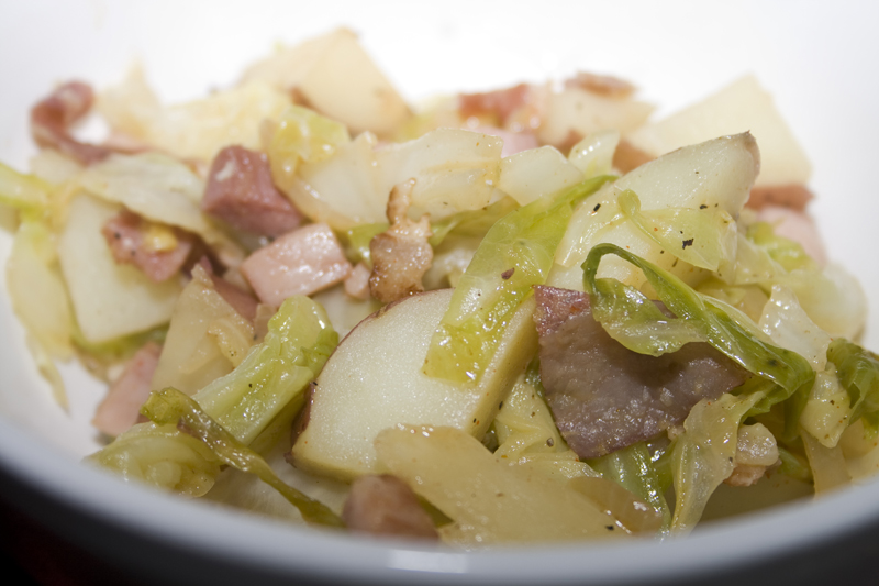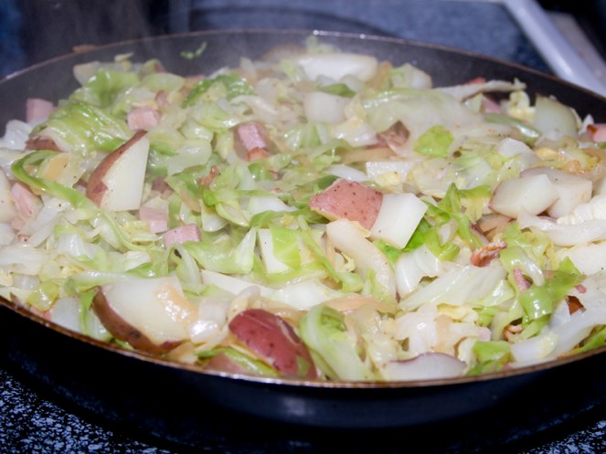 - In a non-stick skillet, cook bacon halfway. Add onion to pan with bacon, cook until softened. Add ham, and cook until heated through. Add butter, then mix in the cooked cabbage and potatoes. Season with paprika, salt, and pepper. Cook until browned on bottom, turn, and brown again.