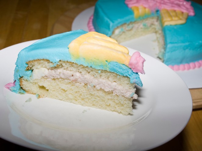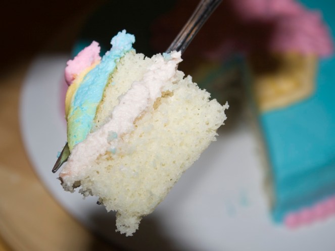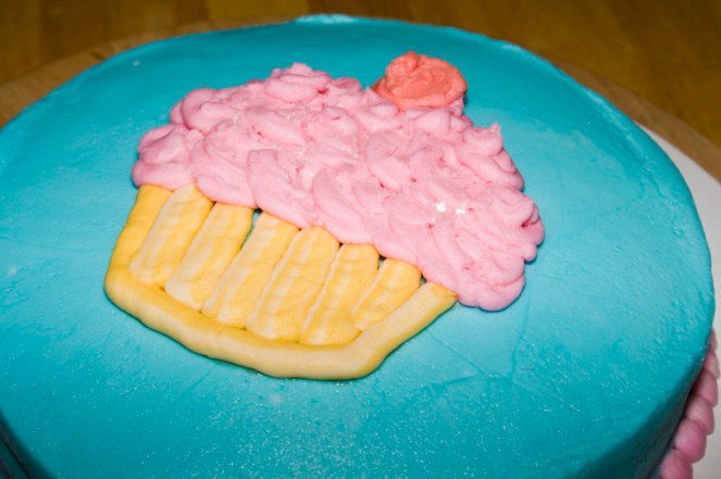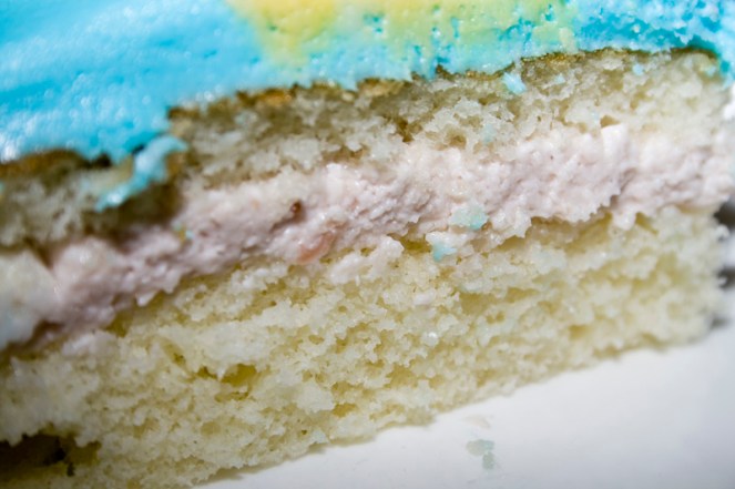 I just used one of the 8 inch rounds the recipe makes. I torted it (still learning the art of doing that evenly too!) and stuffed it with sweet creamy strawberry deliciousness. The other cake went in my freezer to use for another class.