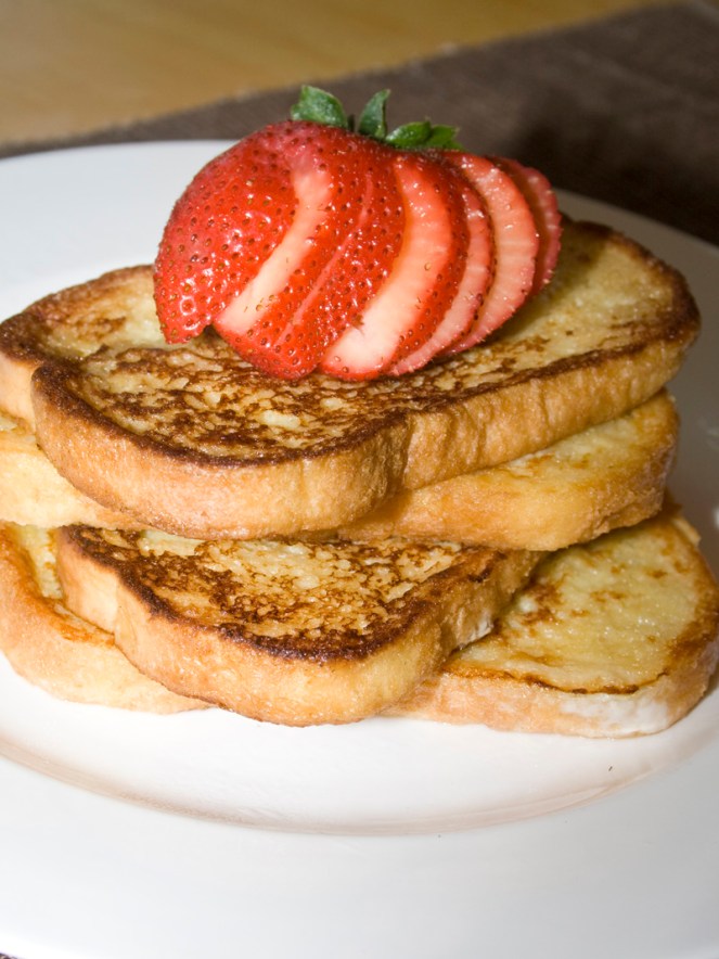 This golden toast doesn’t even really need syrup. My kids (ages 3 and 5) gobbled down several pieces each with only some strawberries on top. Not one complaint.