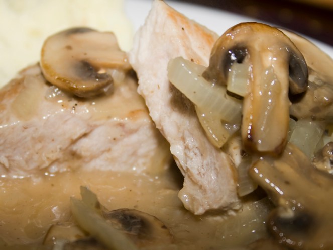 Careful not to overcook your pork (that is what’s hiding under all those shrooms and onions). You do NOT want it to be grey in the middle. Grey = overcooked, tough and dry. Pork is perfect with just the slightest of pink inside. The USDA recommends cooking pork until it is registers 145 degrees Fahrenheit on an instant-read thermometer in the thickest part of the meat. Keep in mind that larger cuts of pork (like roasts and tenderloins) can be removed from the oven at roughly 135 degrees, covered, and allowed to rest, during which time the temperature will rise by at least 10 degrees. Be sure to check the final temperature before serving to make certain that it reaches 145 degrees.