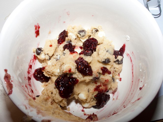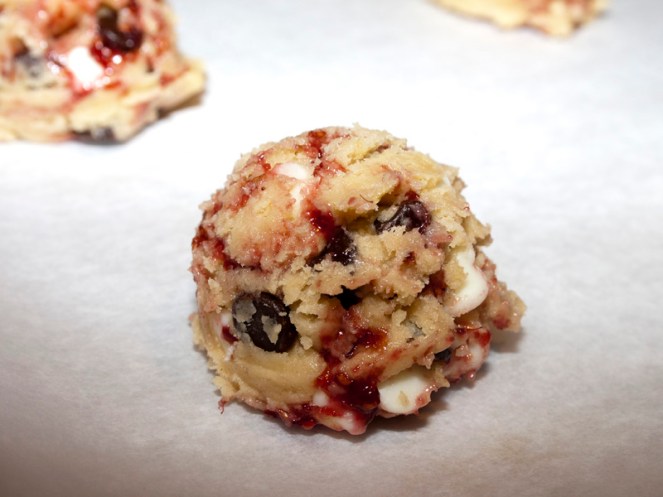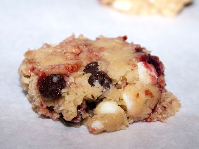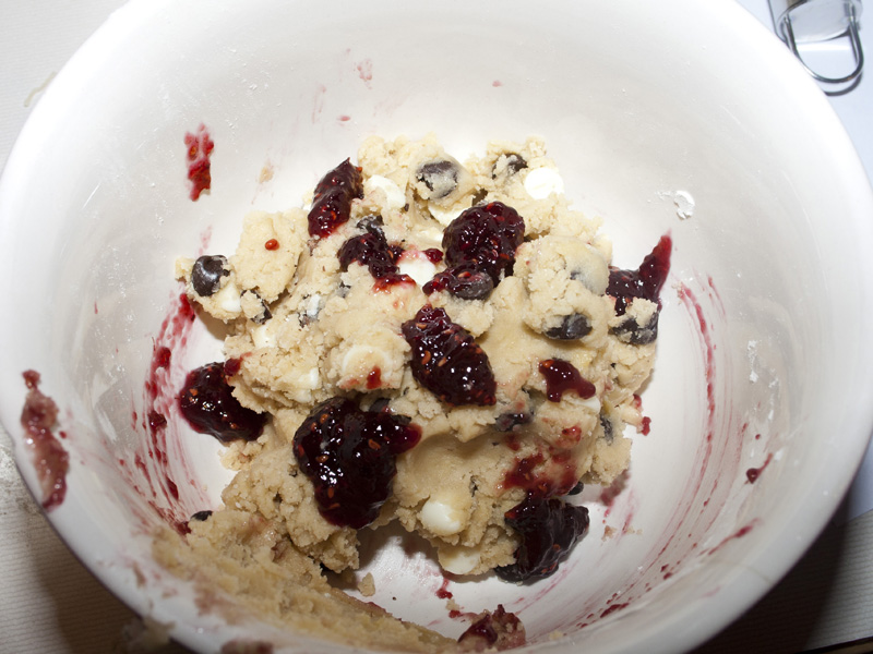 The only trick in making these is the swirl of raspberry. It is VERY easy to mix it too much and end up with a bright pink cookie instead of dancing raspberry swirls. Working 1/4 of the dough at a time is the key to getting the proper twirly action.