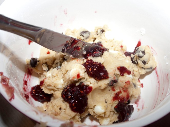 2. Scoop out about 1/4 of the dough into a smaller bowl. Add about 1 T of jam and cut it in using a butter knife. Be careful not to MIX it, or your dough will turn pink, you want more of a swirl.