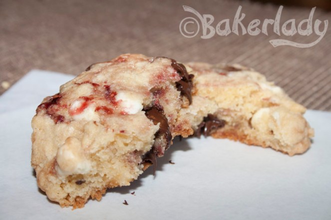 i made these cookies following your recipe but i used fresh raspberries instead of raspberry jam…they’re really good! Have a look here, I mentioned your blog and talk about you: http://dolcementeinventando.blogspot.it/2012/08/cookies-americani-al-cioccolato-bianco.html
