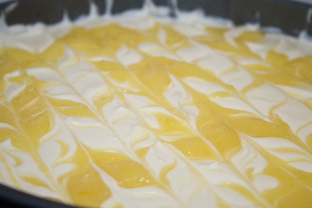The most delicious cheesecake ever. Straight out of Bon Appetit magazine (circa 1989). Light lemon cheesecake with a gorgeous lemon curd swirled thru the top!
