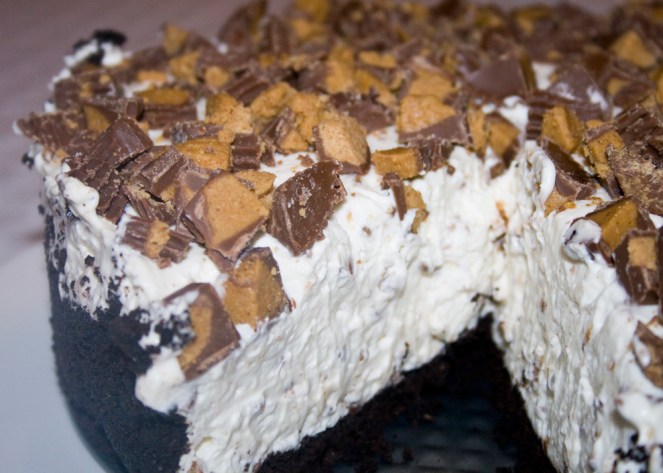 A no bake cheesecake with a chocolate cookie crust and Reese’s Peanut Butter Cups on top.