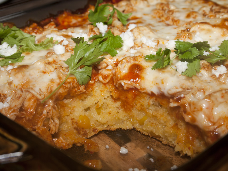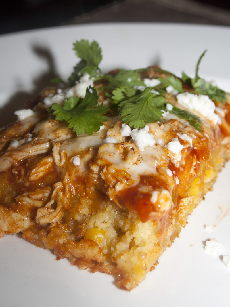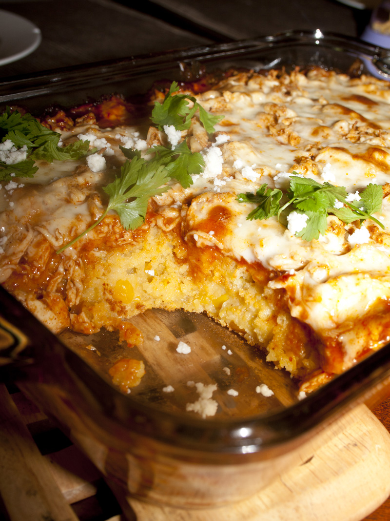My husband loves tamales. My mother-in-law Anna makes them in huge batches and brings them up when she visits. It’s a whole involved process that she tried to teach me once (long ago when I was first married), but the thought of authentic cooking was a total brain overload for me back then. I found this recipe and knew I needed to give it a whirl. It starts with a rich cornbread base filled with chilies, topped with enchilada sauce, spiced chicken and cheese. If you like Mexican food, you will love this!