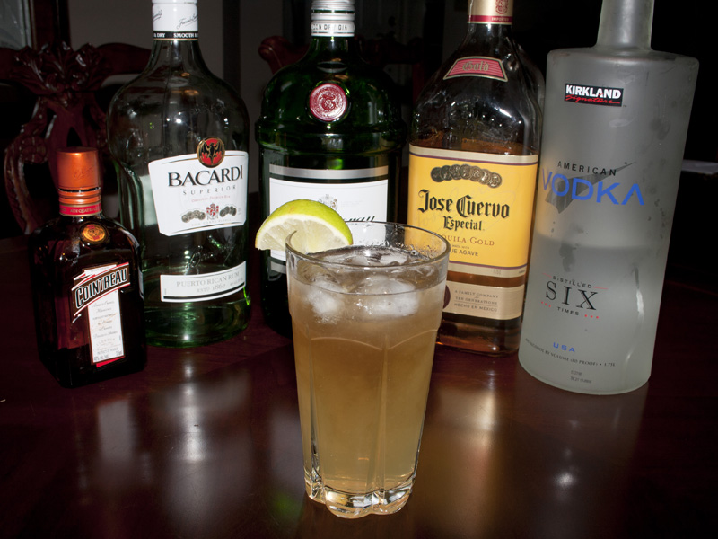 - Fill a cocktail shaker with ice; pour in vodka, tequila, rum, gin, Cointreau, and sweet and sour mix. Cover and shake until the outside of the shaker is frosty. Place a few cubes of ice into a highball glass, and strain in the iced tea. Top with the cola, and garnish with a wedge of lime.