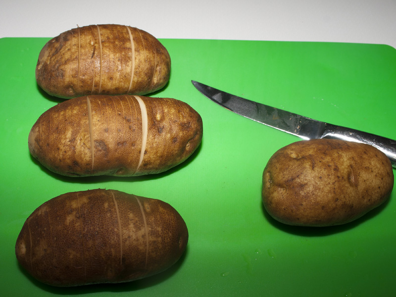 They are part french fry, part baked potato. Incredibly appealing to look at and equally delicious. You start with basic baking potatoes and slice them crosswise, making 1/4-inch apart slices, cutting down vertically.