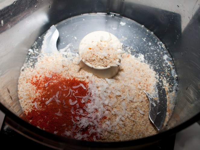 Then, we’re going to make up a quick crumb topping with bread, cheese, butter and paprika.