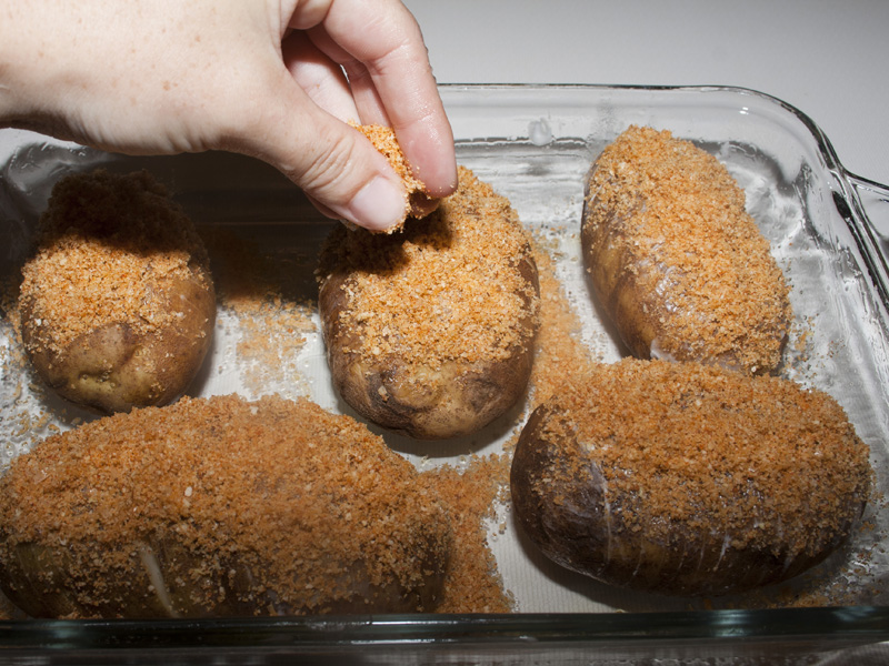 Brush prepared potatoes with 3 tablespoons melted butter (making sure some gets in the potato cracks), and pat the bread crumb mixture on top of each potato.