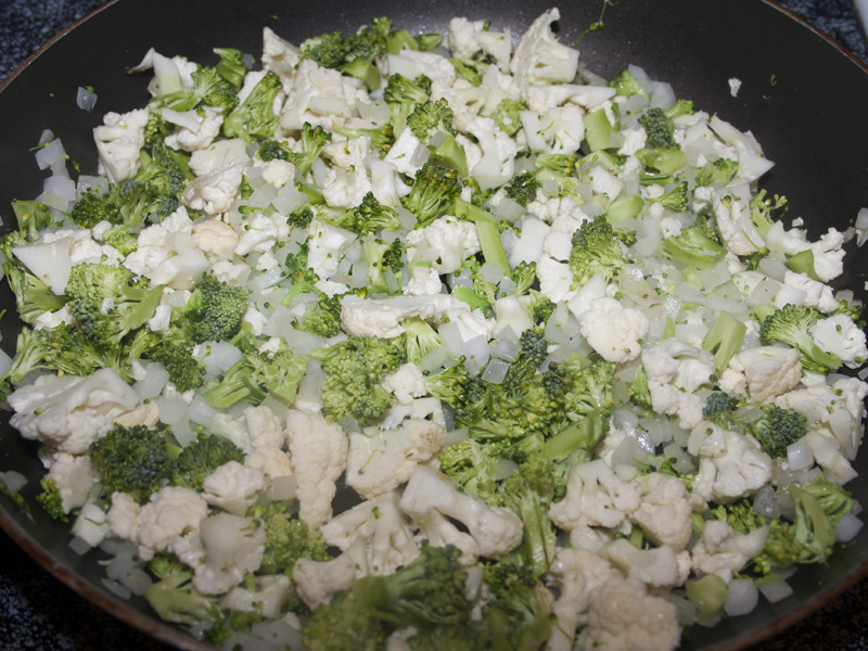 2. In a large nonstick skillet over medium heat, sauté onion until translucent, then add broccoli and cauliflower and stir fry 5 minutes until cauliflower is just starting to golden around the edges.