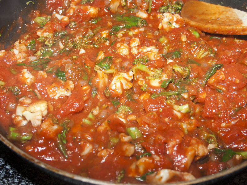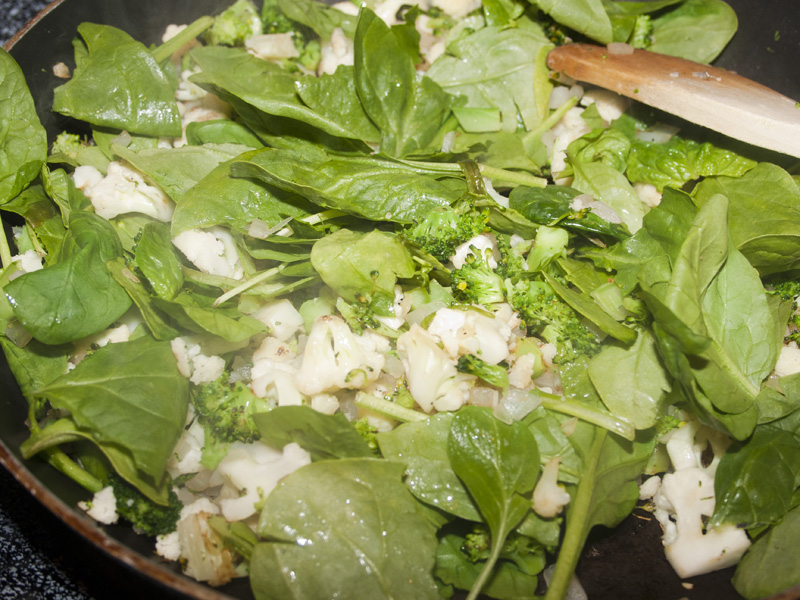 It’s true, I’d become a vegetarian before I’d give up pasta. Or bread. I can live without meat (sort of) but I need crusty warm deliciousness in my life. I figured with broccoli, cauliflower and spinach in place of ground beef, I was sacrificing enough without going full board with zucchini instead of noodles. So, I used my standby quick and easy lasagna but replaced the meat with a whole lotta veggies. Starting with a bunch of broccoli, cauliflower and onions. All cooked up together in a saucepan.