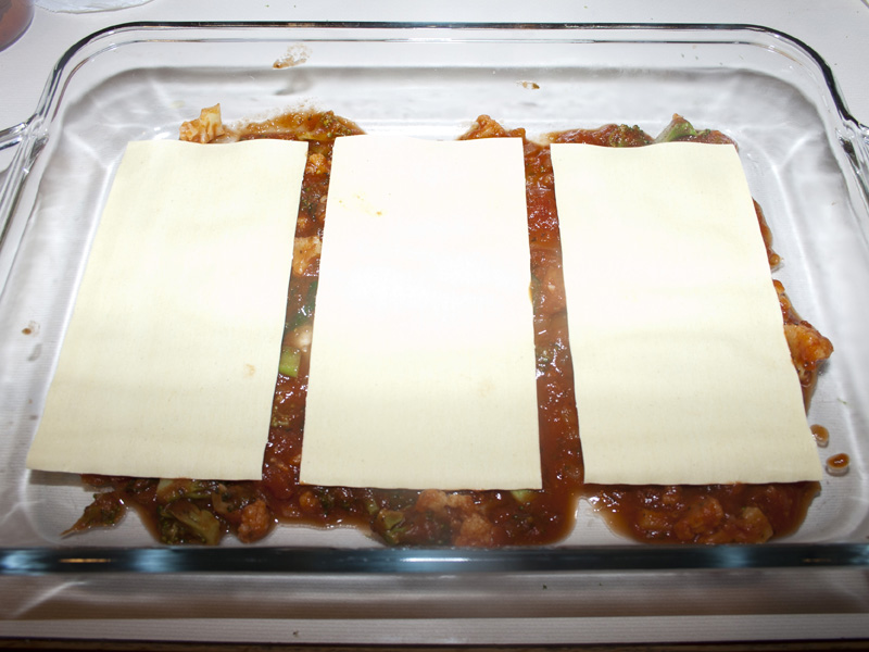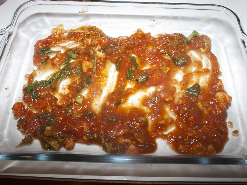 Now we layer the lasagna. Here’s how it goes. Sauce first.