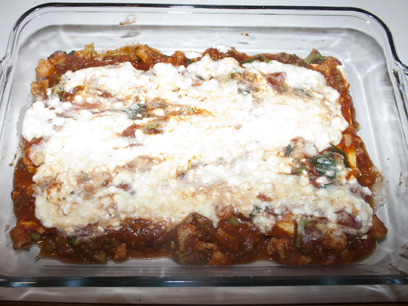 Top with a cottage cheese/egg blend. I love how messy lasagna looks. Just slap it all in there.