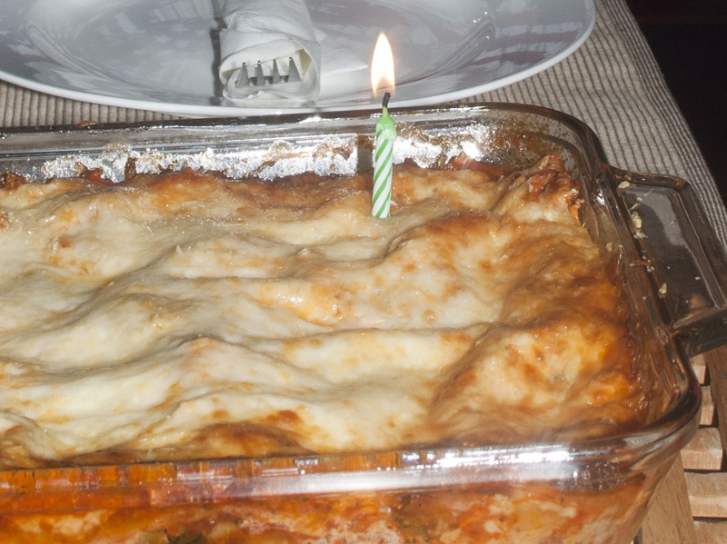 As a public service announcement, I’d like to say that using lasagna as a cake for a birthday celebration is not a good idea. Oh, it’s cute to have a candle burning brightly as you sing over melted cheese and saucy noodle goodness, but then you remove the candle and find that the heat of the lasagna has melted the wax and a whole corner of your lasagna is ruined. RUINED!