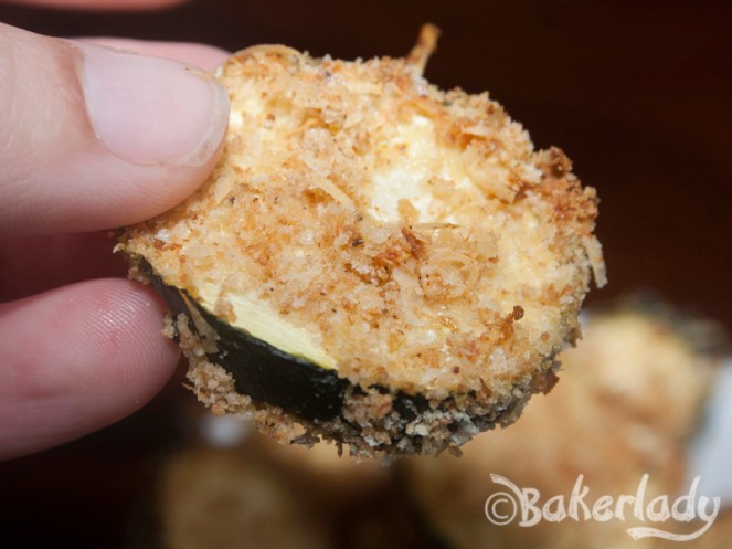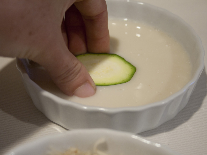 Place milk in a shallow bowl. Dip zucchini slices in milk, and dredge in breadcrumb mixture.
