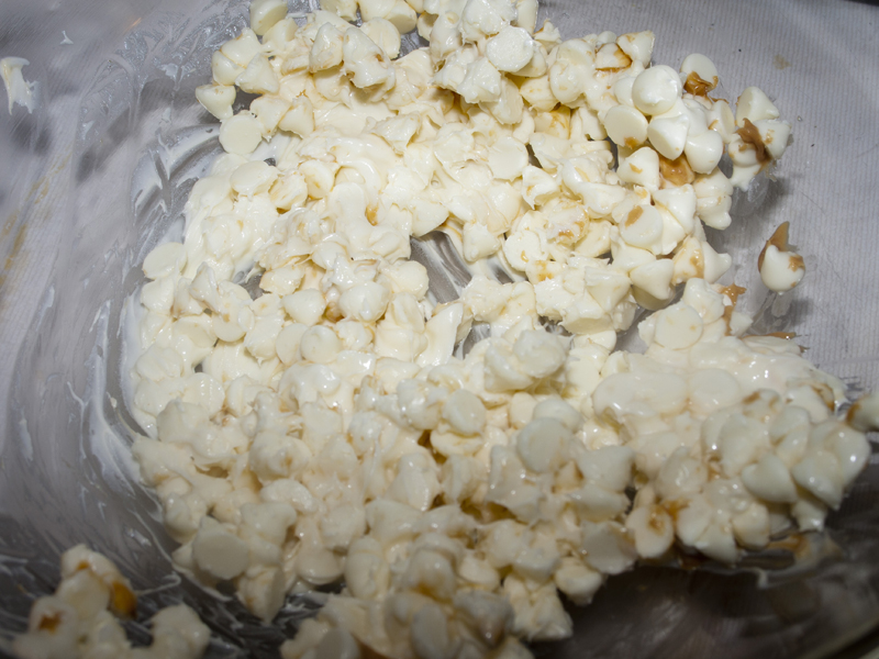 - In microwave-safe bowl pour in white chips and heat on 50% power for 1 minute. Add butter. Stir and continue in 30 second increments until chips & butter are melted together.