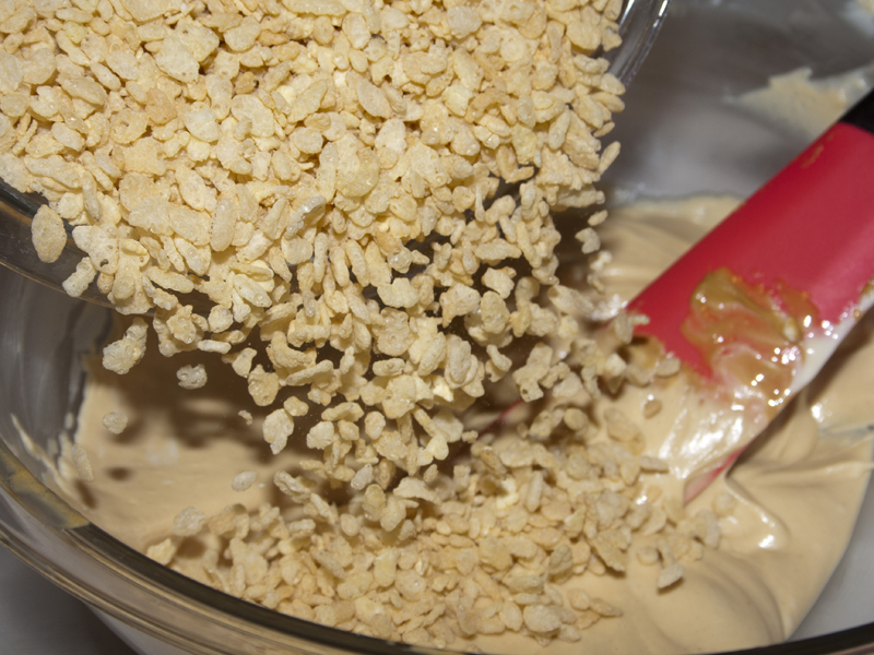 - Combine the peanut butter with the melted chips and add the krispies.