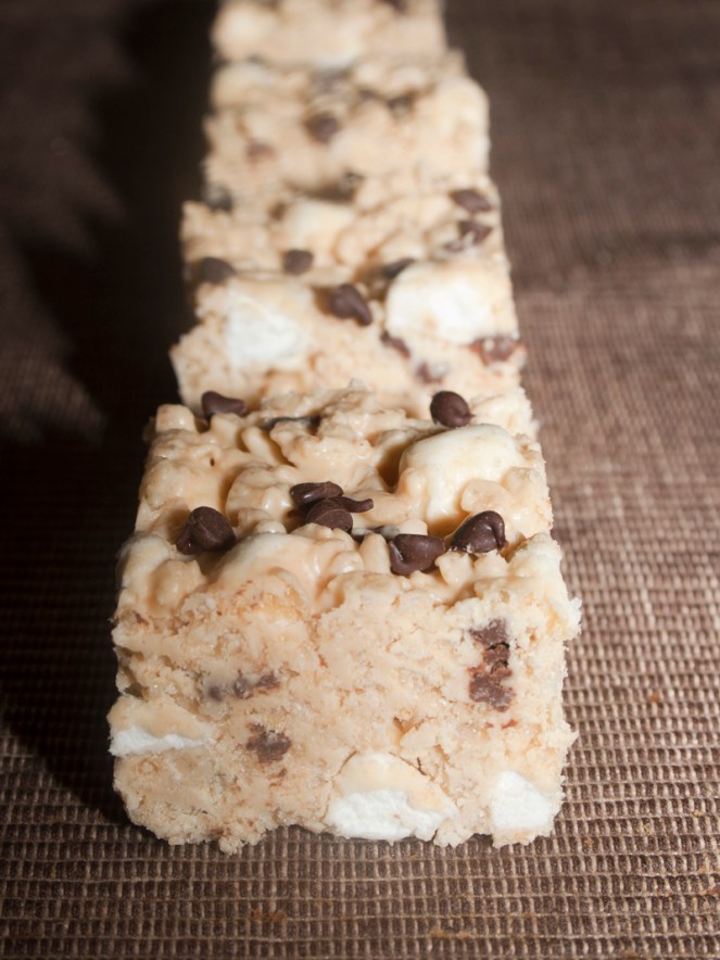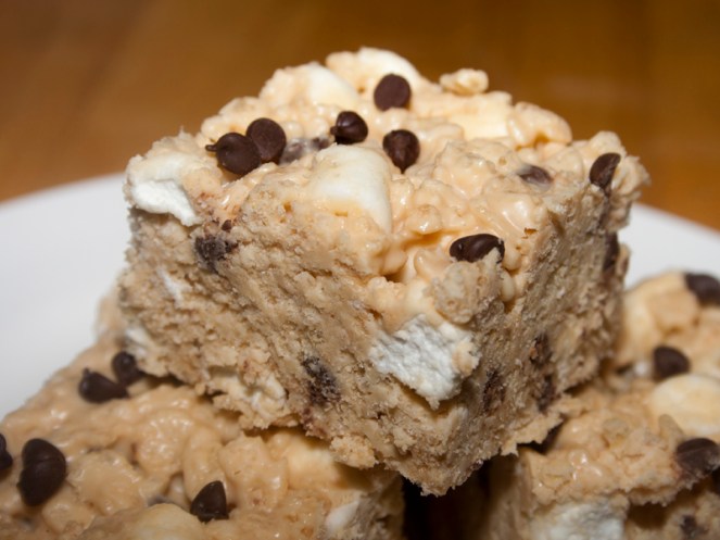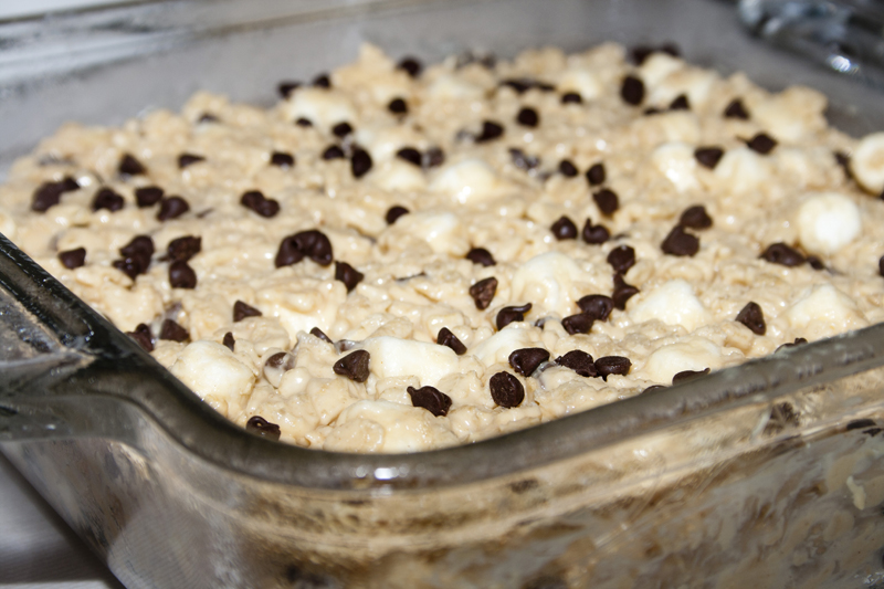 These babies are rich and absolutely decadant. They are full of white chocolate, marshmallows, chocolate chips, peanut butter and a little crunch from rice krispies. They actually reminded me of my crispy peanut butter balls, but without all the rolling and dipping. You start with some white chocolate and melt it up. I tweaked the recipe and added a wee bit of butter to this step because the original blogger mentioned that if you press them into the pan too firmly, they’ll get hard. It worked! Mine didn’t have any firmness problems!
