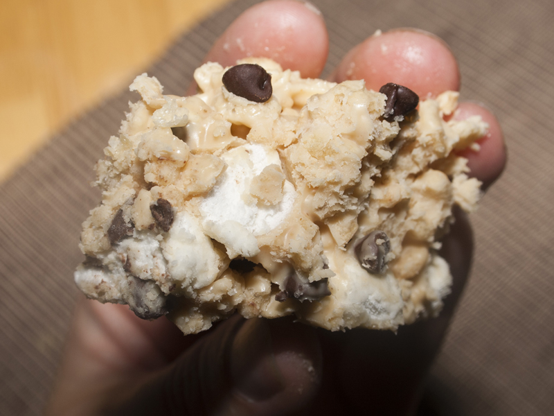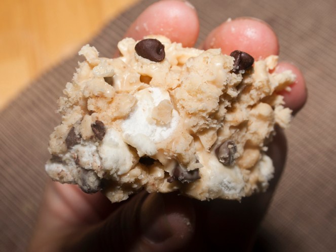 Add some rice krispies and let it cool for a bit. You’ll be stirring in ingredients that could melt, so you need a little patience or it’ll all just blend together.