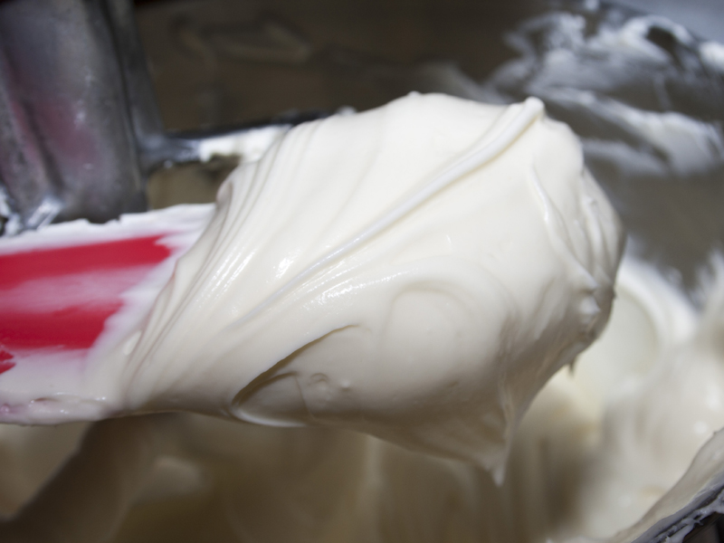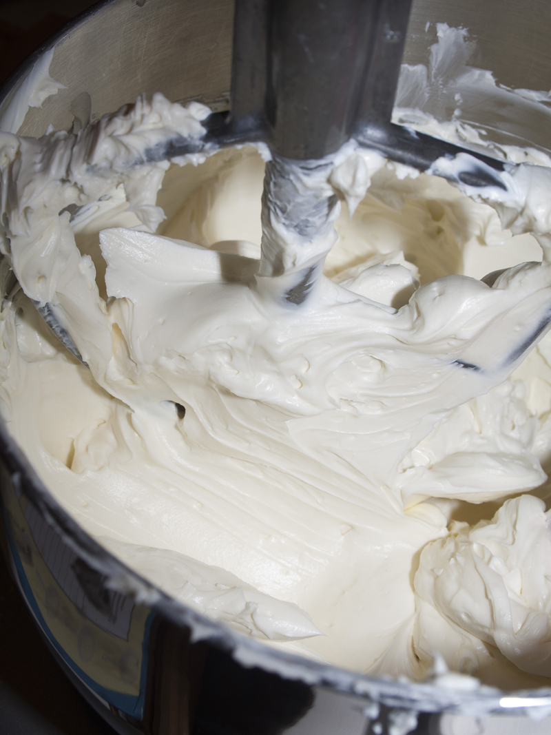 Then add some sugar and blend again. Again, don’t beat it like crazy, just a low(ish) blending. If your cream cheese is the right temperature, you don’t need a lot of power to make it creamy.