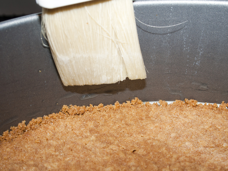 Yup, brush that melty deliciousness all along the sides of your pan, being careful not to disturb your crust. I find the only way I don’t spaz out and mess the grahams up is to start right where the crust ends and brush upward. Away from the crust.