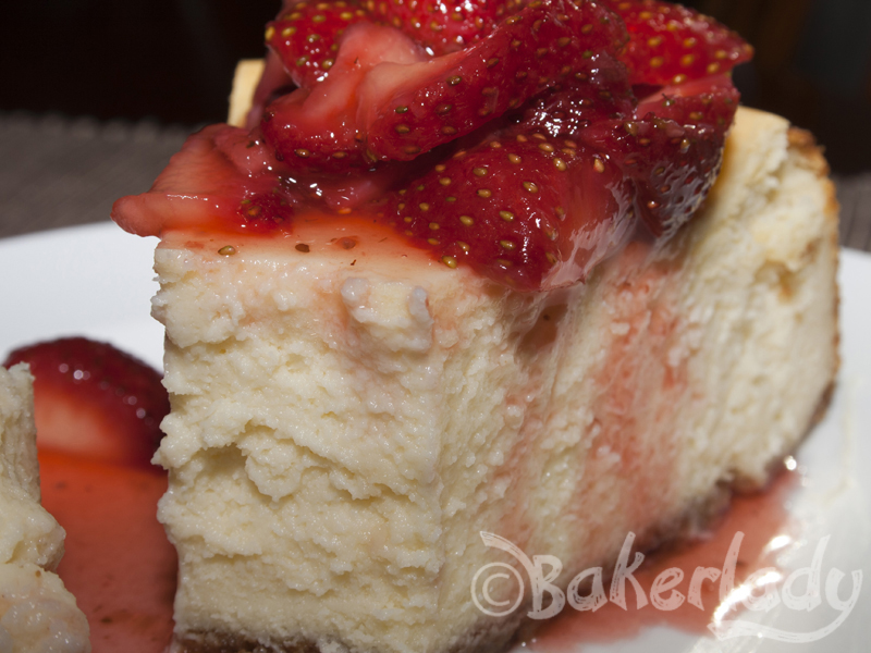 Transfer the cake to a wire rack and run a knife around the edge of the cake. Let the cheesecake stand until just barely warm, 2 1/2 – 3 hours. Chill until ready to eat. Serve as is or with Strawberry Topping.
