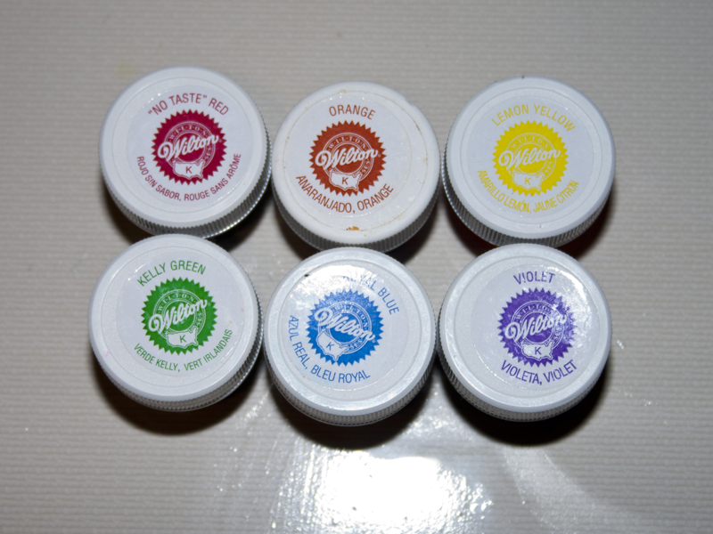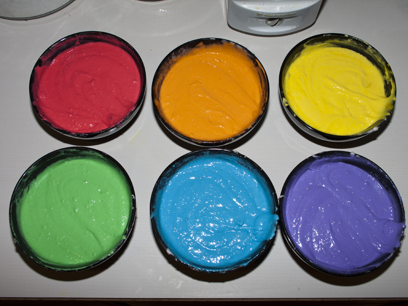 I made three boxed white cake mixes, substituting melted and cooled butter and whole milk for the oil and water. I then separated the batter into six bowls and set to making a rainbow of colors. I ended up with 1 3/4 cups of batter in each bowl. I had a little bit left over that I left uncolored and made 8 cupcakes out of.