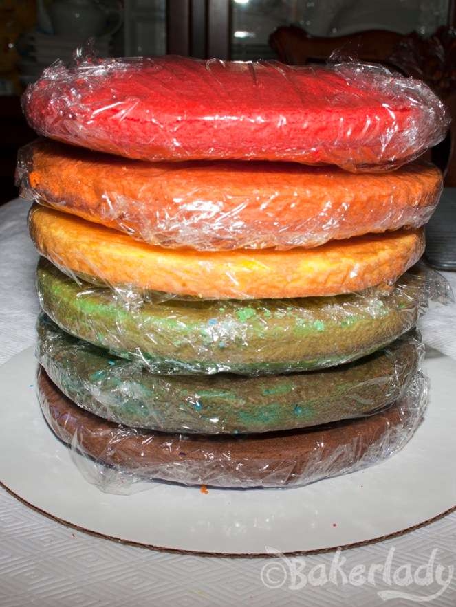Grease and flour as many 9 inch cake pans as you can get ahold of. Cook the cakes two at a time at 350° (about 15 minutes). Don’t worry if the outside gets a dull color, the inside will still be vibrant. Cool about 5 minutes in the pan then turn out onto a wire rack to cool completely. I place some waxed paper over the top of each pan before flipping them out so that the wire rack doesn’t dig into the soft cake. When cakes are all cooked and cooled, trim (if needed) to flatten out the tops. Eat the bits…you know, to check for poison.