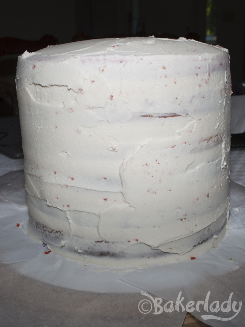 Put your cake in the fridge for about 30 minutes to solidify the crumb layer. Then pull it out and frost it again. This is the pretty layer. I use an offset spatula. Let it set for about 15 minutes, then rub a paper towel around the outside (lightly) to smooth out any little bumps.